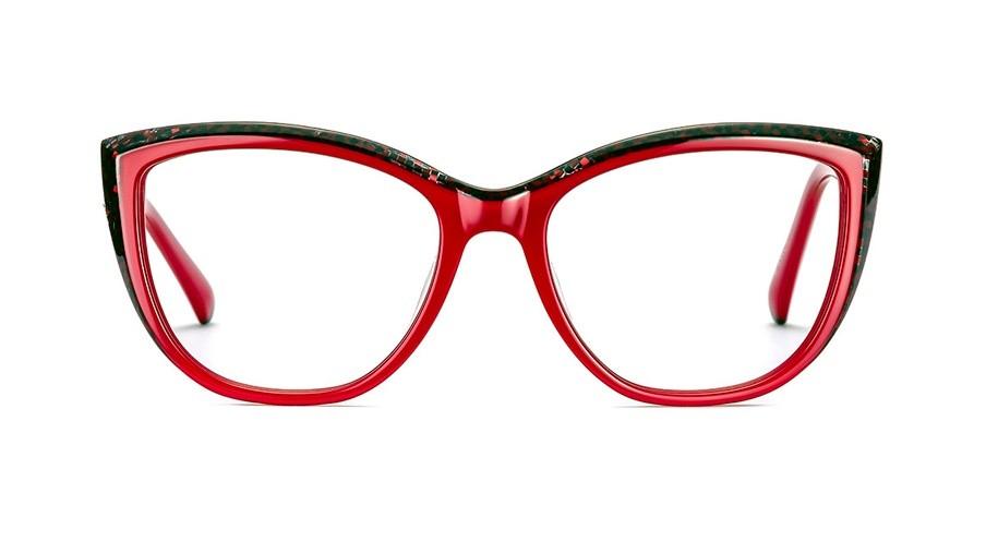 Kobieca oprawka o kocim kształcie w kolorze czerwonym. Oprawka posiada czarny wzorek na brewce i zewnętrznej krawędzi tarczy.