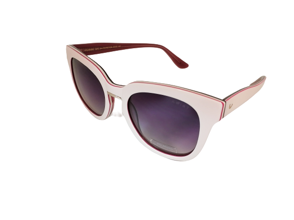 Zaokrąglone okulary przeciwsłoneczne z fioletowymi gradientowymi soczewkami. Oprawka wykonana z tworzywa sztucznego w jasno różowym kolorze na przodzie i ciemniejszym od środka.