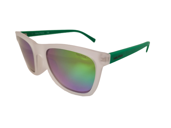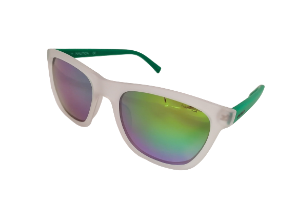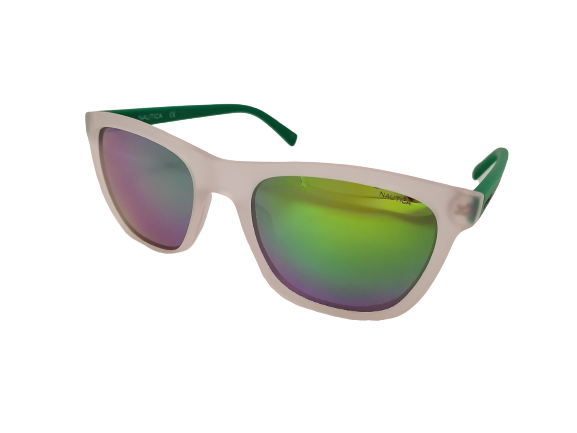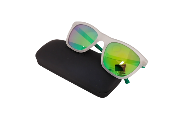 Okulary przeciwsłoneczne wykonane z tworzywa sztucznego z transparentnym przodem i zielonymi zausznikami. Okulary posiadają luustrzane spczewki w kolorze zielonym.