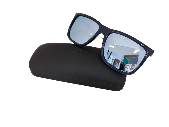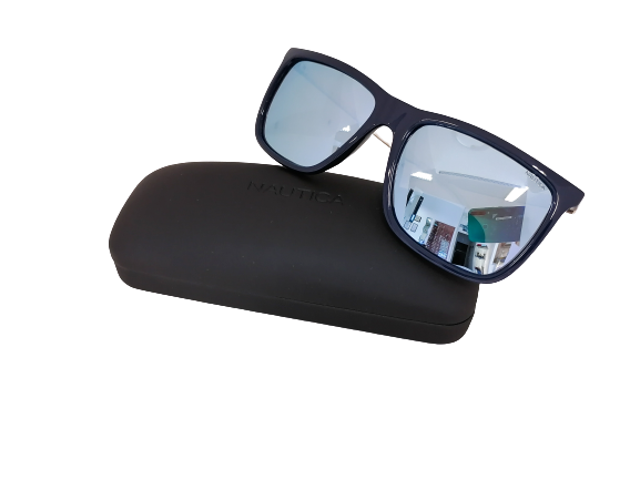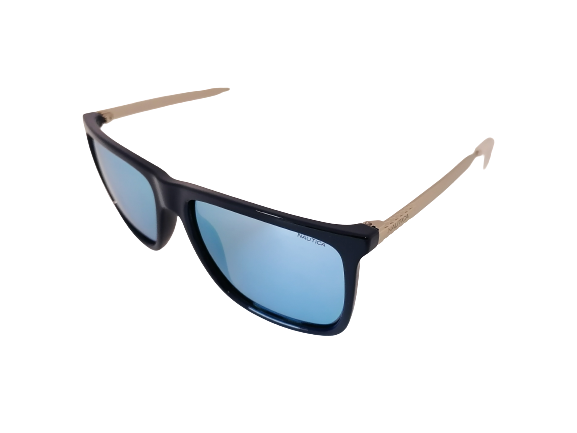 Okulary przeciwsłoneczne o klasycznym kształcie z tarczą w kolorze intensywnego granatu. Front wykonany jest z tworzywa sztucznego a zauszniki są ze srebrnego metalu. Okulary posiadają lustrzane soczewki o niebieskim kolorze.