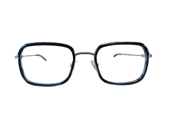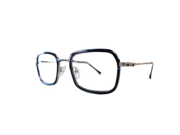Prostokątne oprawki wykomnane z połączenia tworzywa sztucznego i metalu. Front w kolorze granatu ze srebrnymi zausznikami.