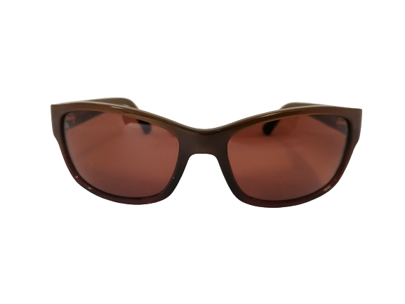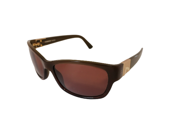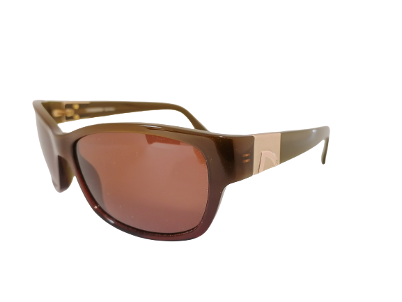 Okulary przeciwsłoneczne o prostokątnym zaokrąglonym kształcie. Przód oprawy jest w brązowym kolorze. ZIelone zauszniki ozdobione są zlotymi elementami. Okulary posiadają brązowe soczewki.