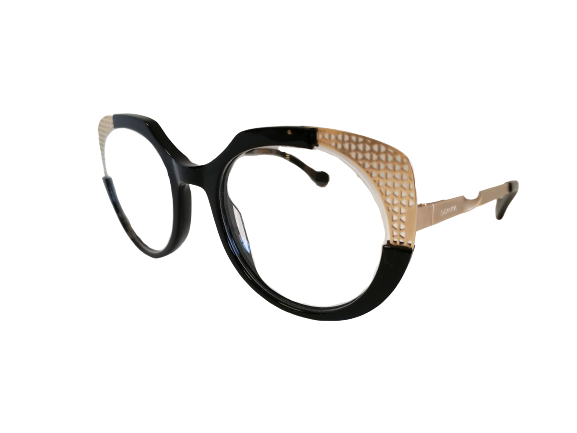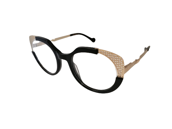Okrągłe oprawki z czarnego tworywa sztucznego. Na narożnikach oprawki posiadają złotą ozdobną siatkę.