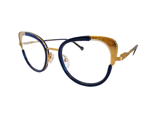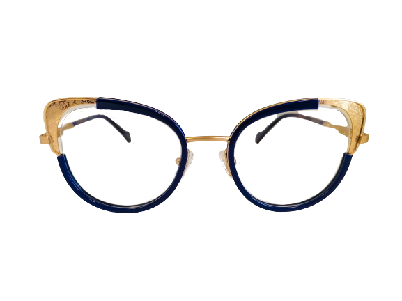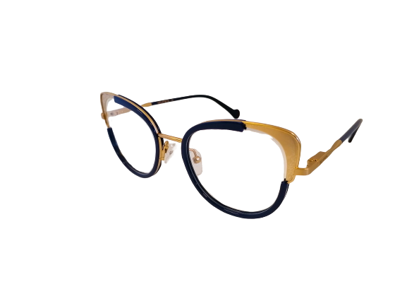 Okrągłe, lekko kocie oprawki z metalu i tworzywa sztucznego. W narożnikach okulary posiadają złoty ozdobnik.