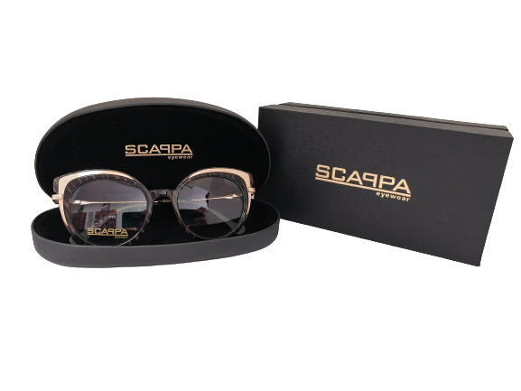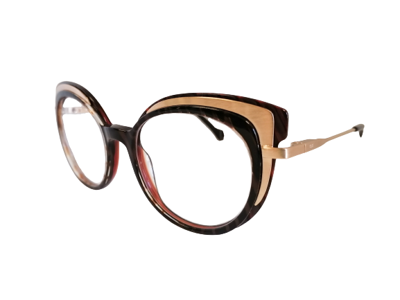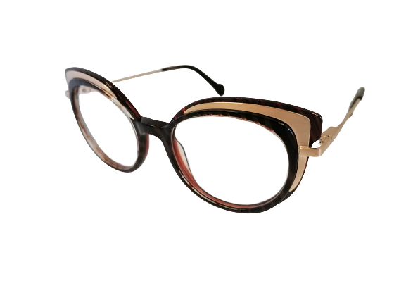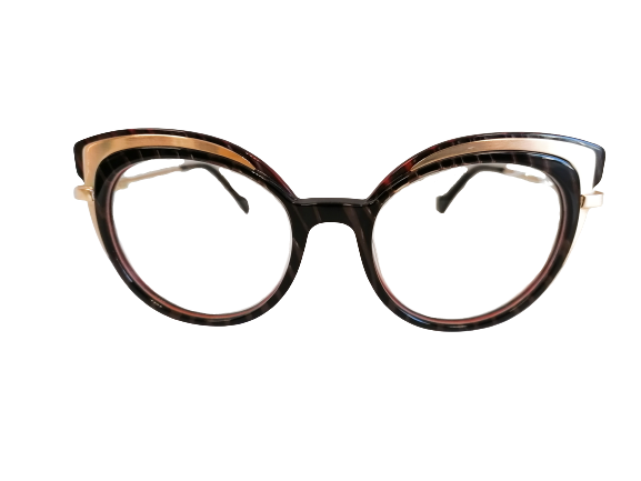 Okrągłe oprawki wykonane z tworzywa sztucznego, Tracza posiada złote zdobienia na narożnikach.