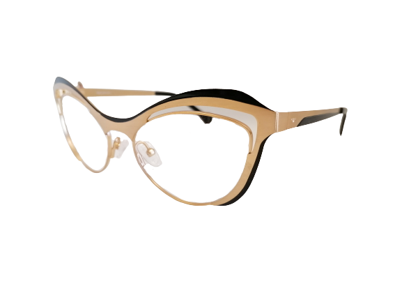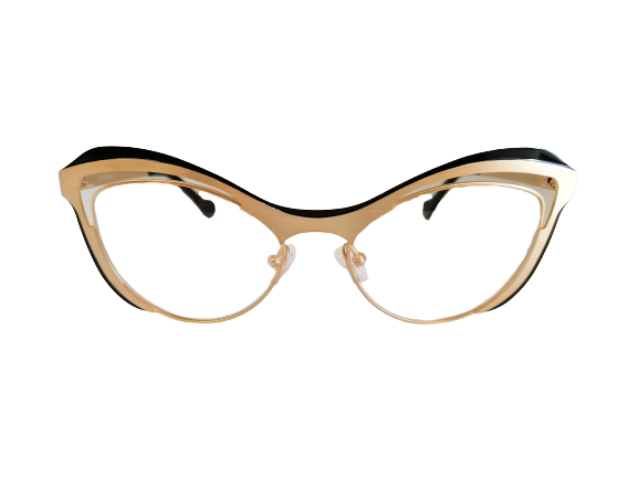 Orginalne oprawki z metalu. Okulary mają koci kształt z wyrazistą złoto - czarną brewką.