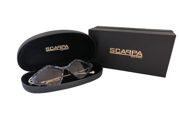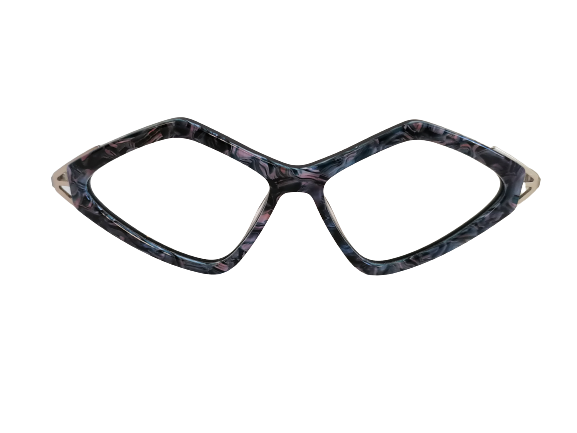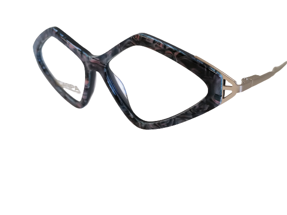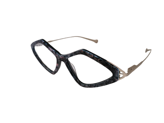 Oprawki w nicodzinnym kształcie, tarcza wykonana z tworzywa sztucznego w niebieskim marmurkowym kolorze. Zauszniki wykonane ze srebrnego matalu.
