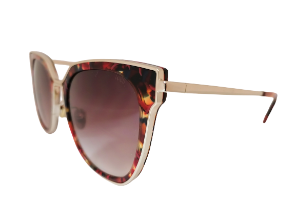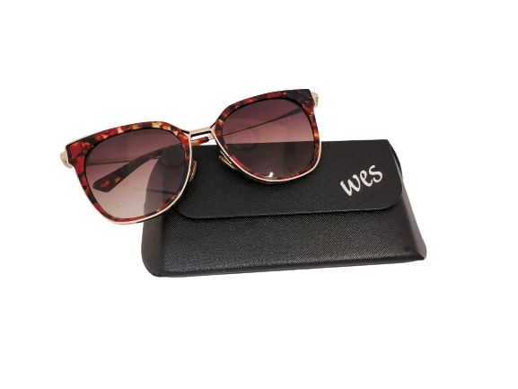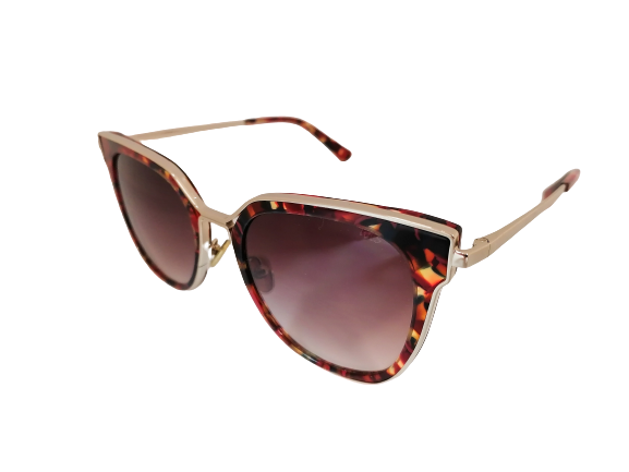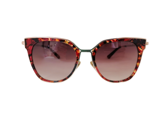 Ręcznie robione okulary przeciwsłoneczne o zaokrąglonym kształcie. Wykonane z tworzywa sztucznego i złotego metalu. Front opraw jest transparentny z zatopinymi płatkami w kolorze czerwieni i czerni. Okulary posiadają gradialne brązowe soczewki.