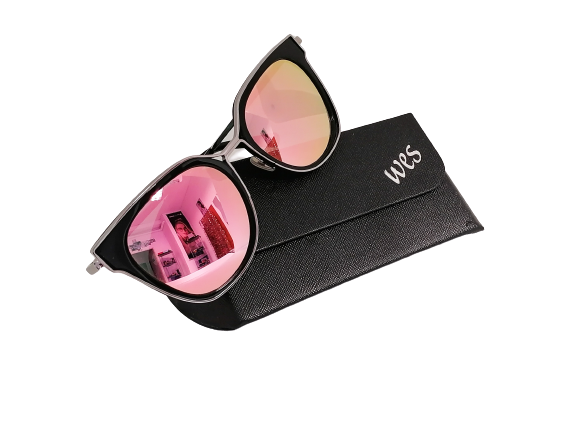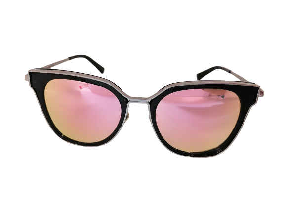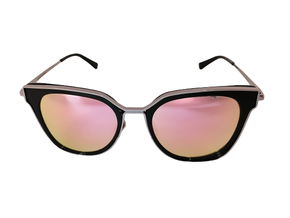 Ręcznie robione okulary przeciwsłoneczne o zaokrąglonym kształcie. Wykonane z tworzywa sztucznego i srebrnego metalu. Front opraw jest czarny. Okulary posiadają lustrzane różowe soczewki.